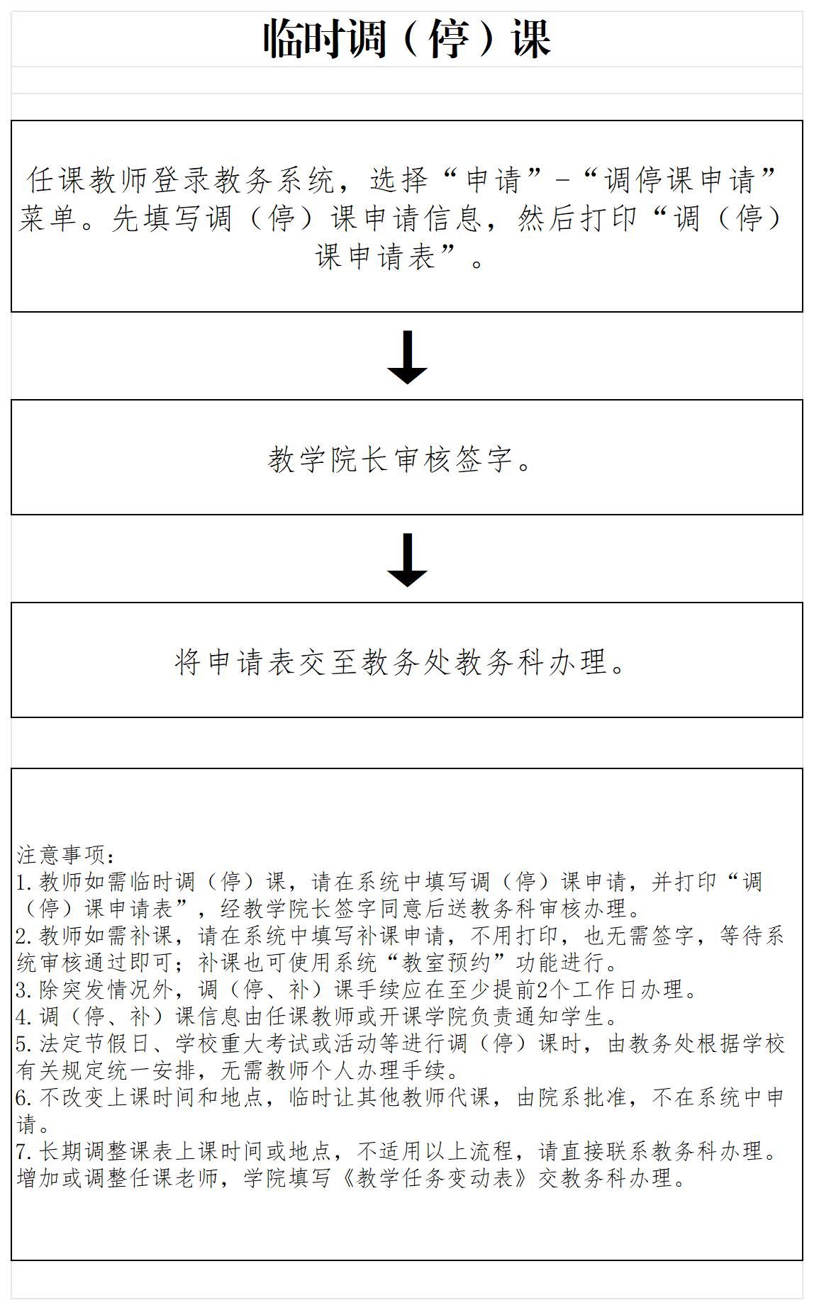 1.教师如需临时调(停)课,请在系统中填写调(停)课申请,并打印“调(停)课申请表”,经教学院长签字同意后送教务科审核办理。